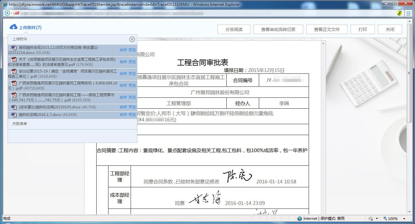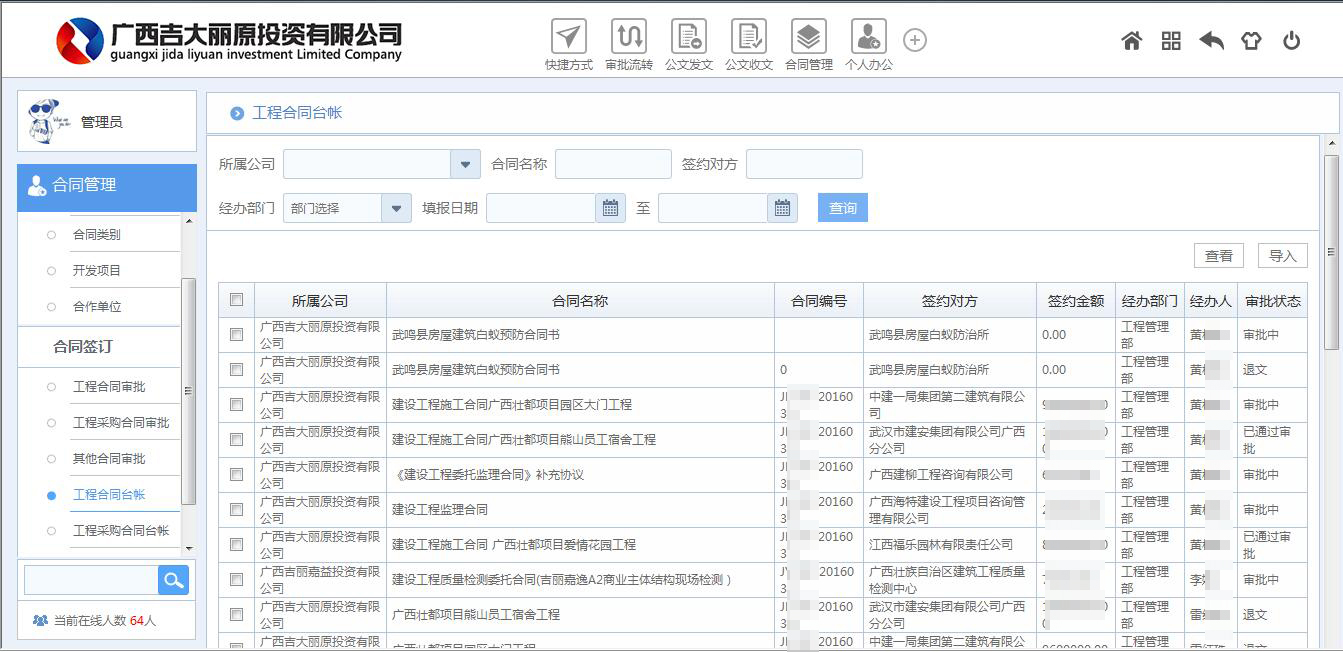 對所有涉及合同業(yè)務(wù)的流程進(jìn)行優(yōu)化和梳理,同時(shí)根據(jù)部門權(quán)責(zé)和審批要點(diǎn)通過表單工具和流程引擎進(jìn)行固化和控制,使業(yè)務(wù)數(shù)據(jù)和崗位在業(yè)務(wù)流程發(fā)生的過程中進(jìn)行合理科學(xué)的管控,對相關(guān)的數(shù)據(jù)表單和業(yè)務(wù)屬性按照需求進(jìn)行充分的關(guān)聯(lián),使用戶在過程中極為方便的查詢和調(diào)用,同時(shí)我們通過強(qiáng)大的報(bào)表引擎進(jìn)行各類業(yè)務(wù)數(shù)據(jù)的自動(dòng)統(tǒng)計(jì)匯總分析,實(shí)現(xiàn)合同的統(tǒng)一管理,可控、可知,為領(lǐng)導(dǎo)實(shí)時(shí)展示單位項(xiàng)目經(jīng)營數(shù)據(jù)匯總情況,使異常信息得到及時(shí)處理,規(guī)避企業(yè)財(cái)務(wù)及法律風(fēng)險(xiǎn)。