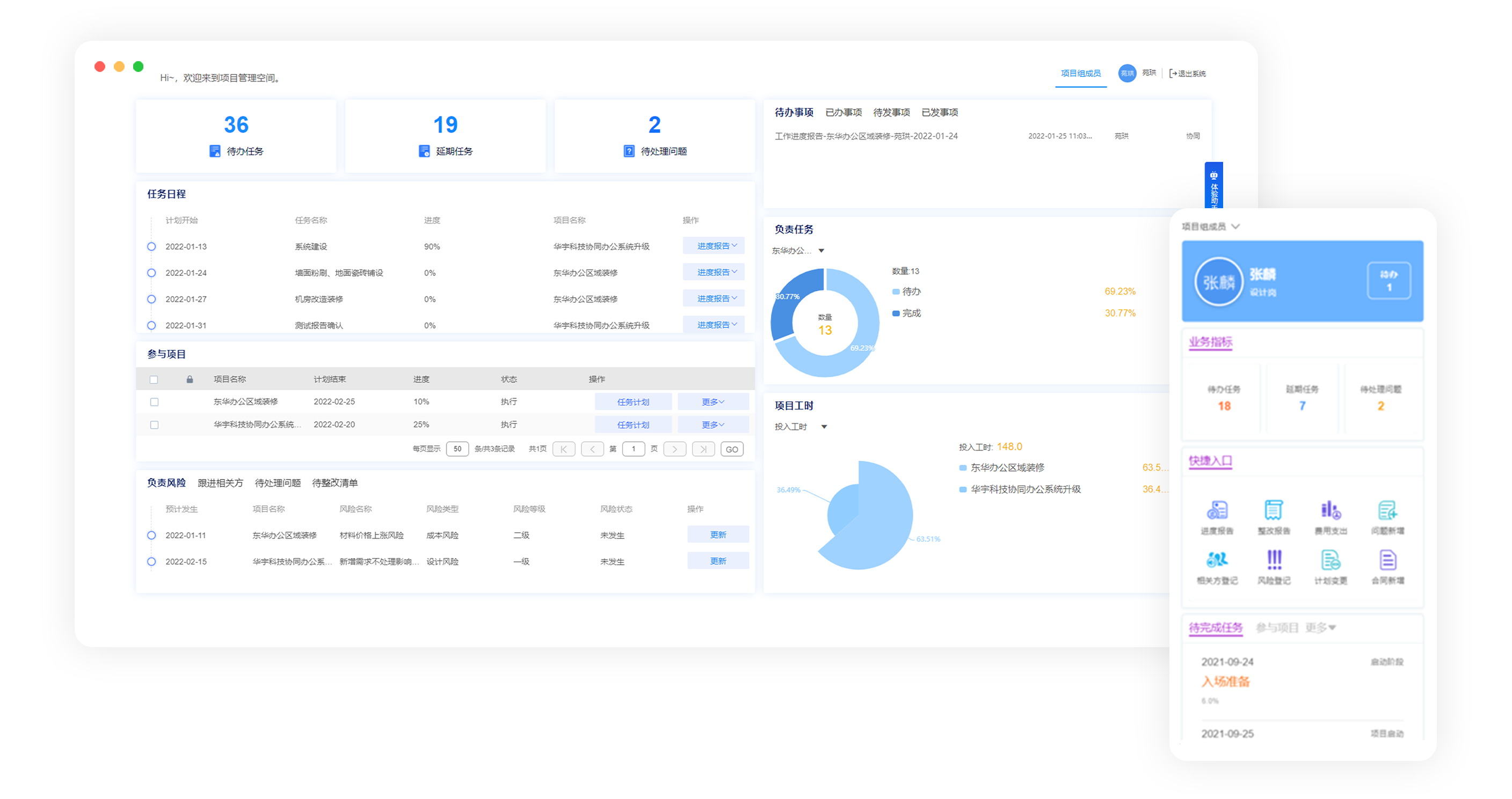 查查看個人任務日程及完成情況、匯報任務進度,了解項目整體情況及個人工時投入,處理風險、相關方、問題關聯(lián)事務。