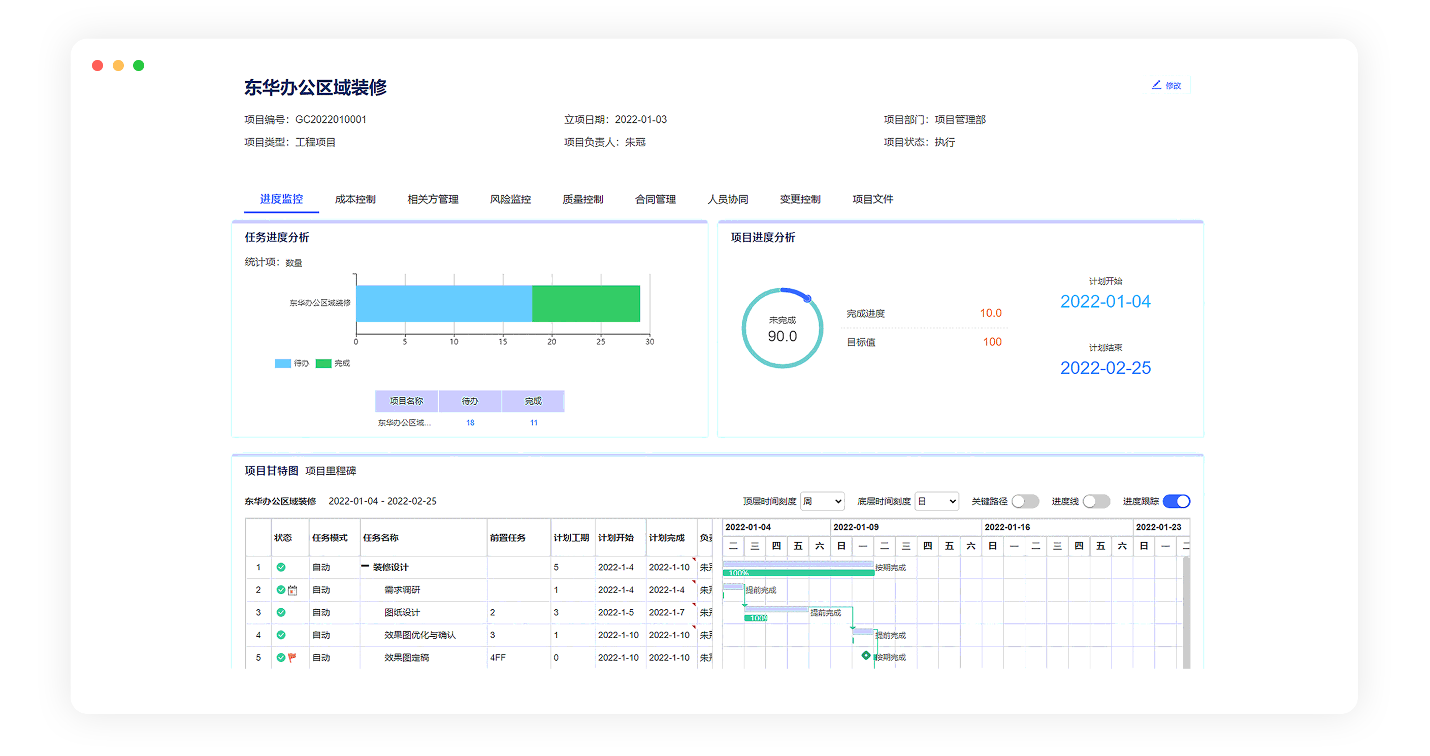 查看任務進度、工作報告、人資投入、合同收付款以及延期任務、現(xiàn)存風險、問題等,快速創(chuàng)建任務計劃,發(fā)起、處理相關事務。