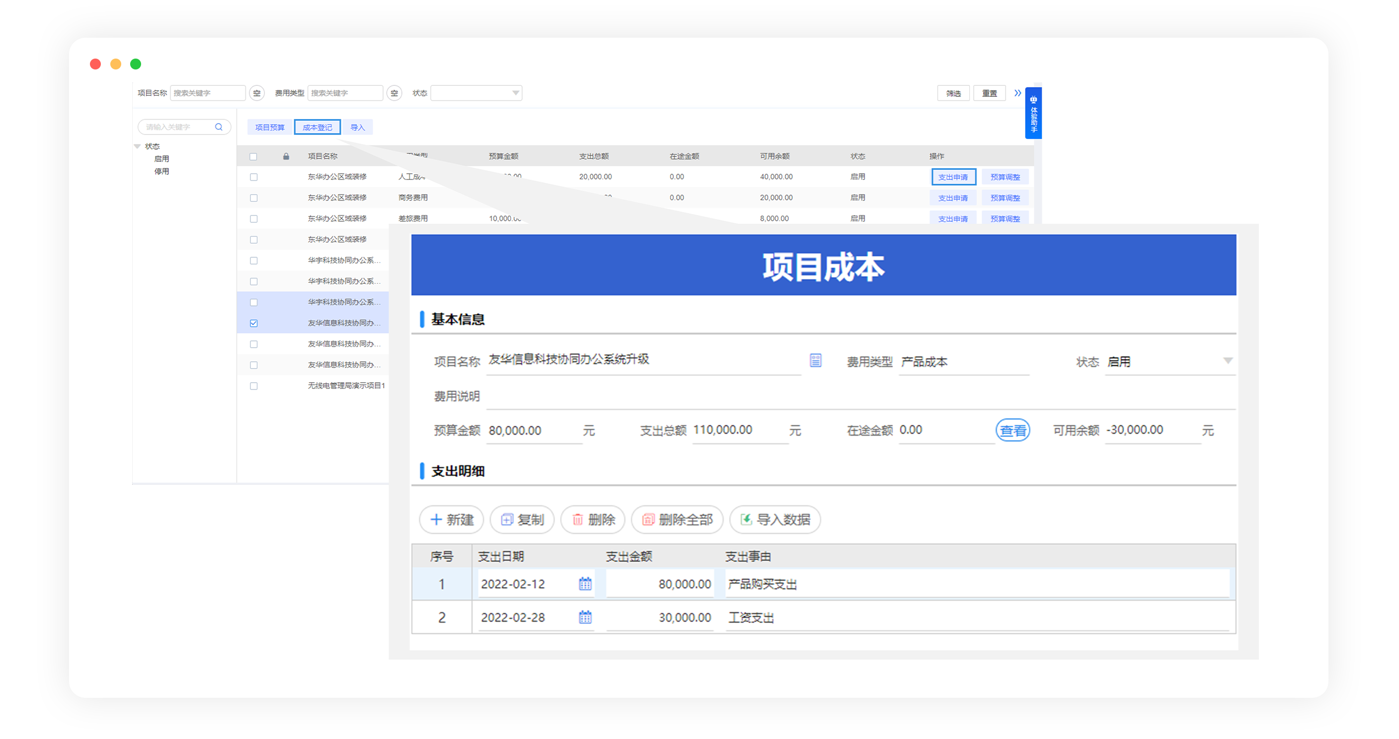 通過審批流程控制預算支出,費用支出后信息自動記入支出明細表,對應的項目預算余額同步更新。對未經(jīng)審批直接使用的特殊費用,支持事后補充登記,確保每筆費用支出清楚記錄。