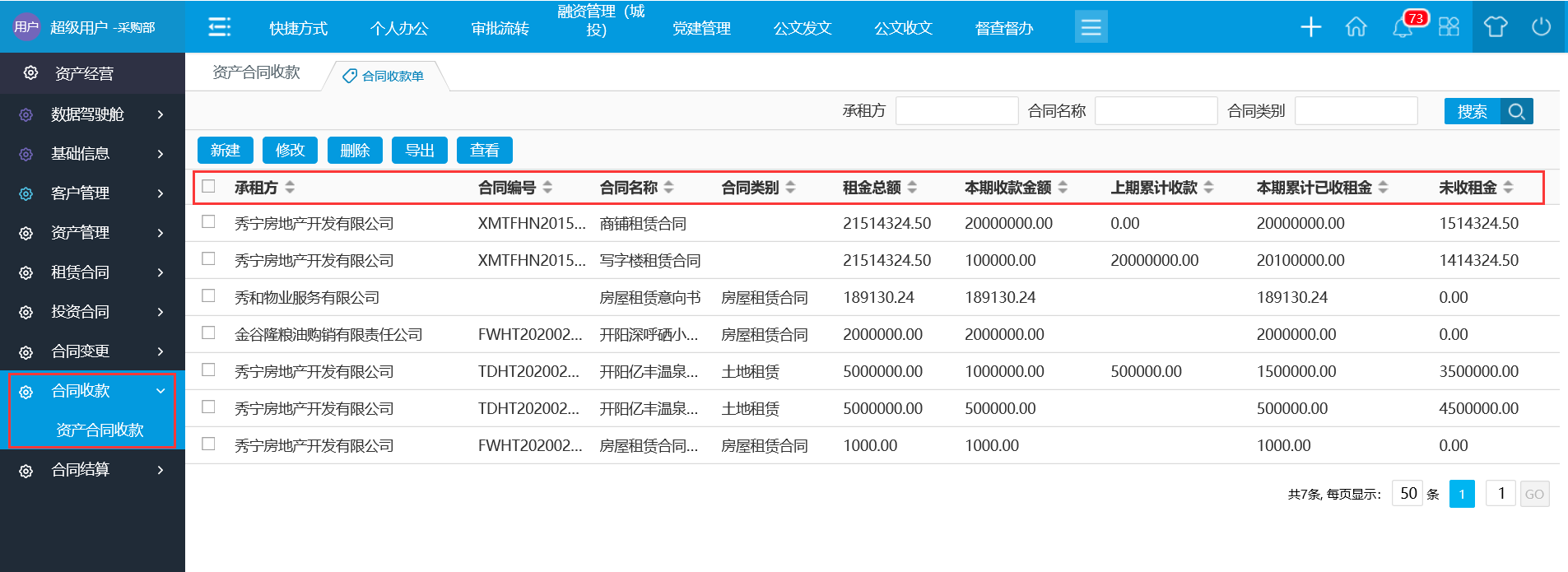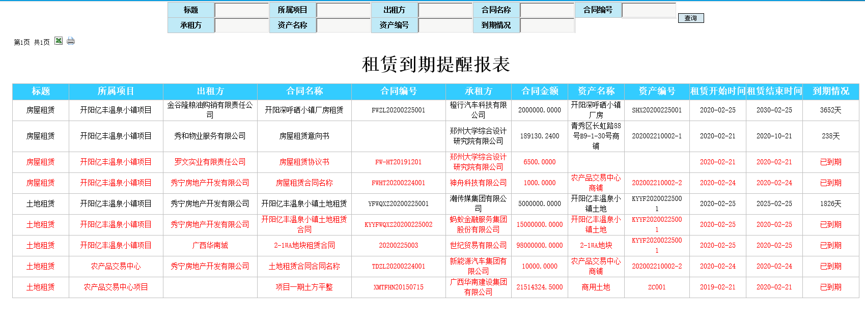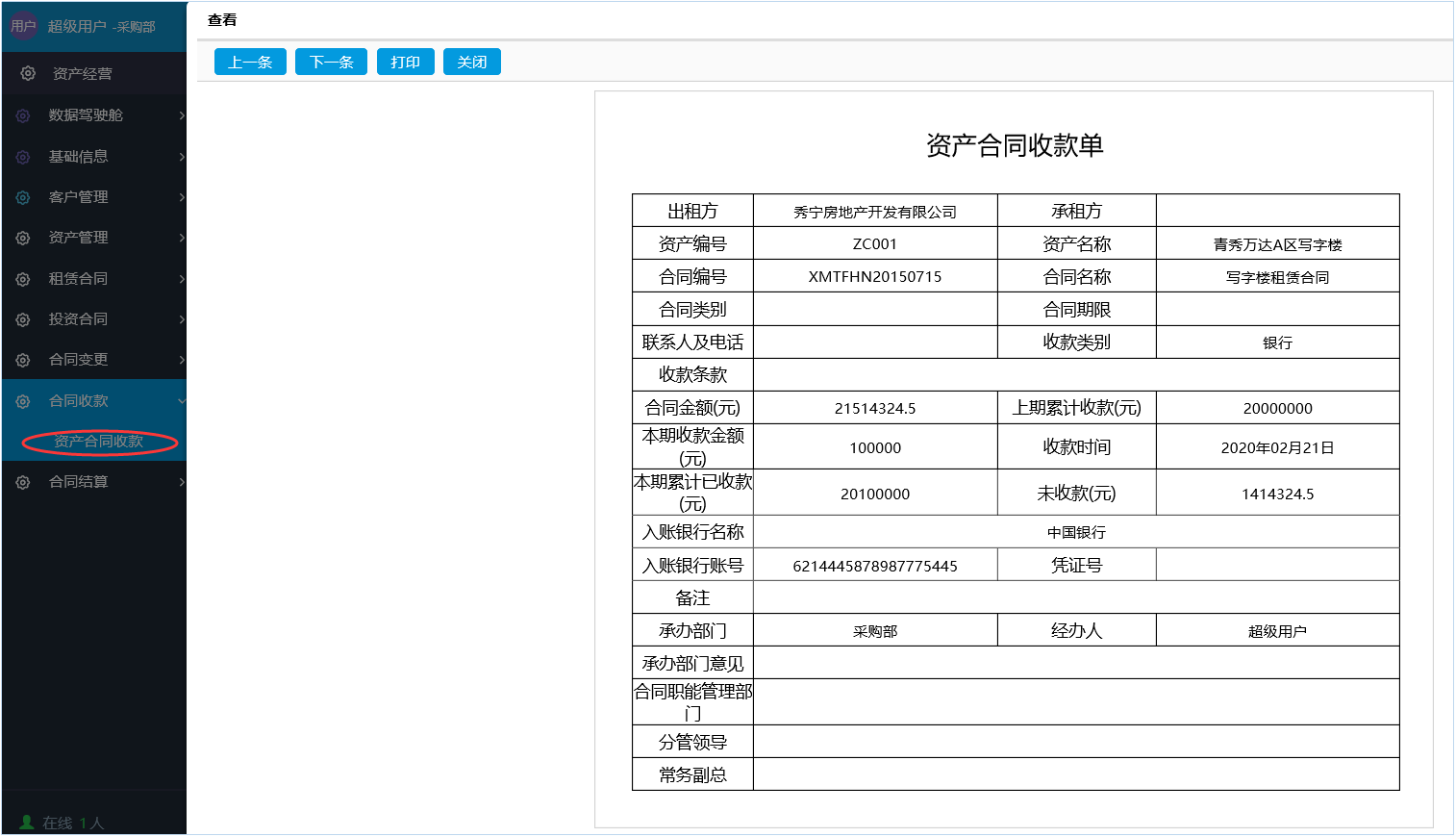 通過系統(tǒng)平臺記錄每一個資產(chǎn)物業(yè)有效租賃合同每一筆收租信息,系統(tǒng)支持查詢關(guān)聯(lián)自動獲取租賃合同基本信息、歷史收款信息、累計(jì)收款金額、剩余未收款金額,每次收款記錄登記完畢后系統(tǒng)自動更新收款明細(xì)臺賬,支持在線查詢跟導(dǎo)出。