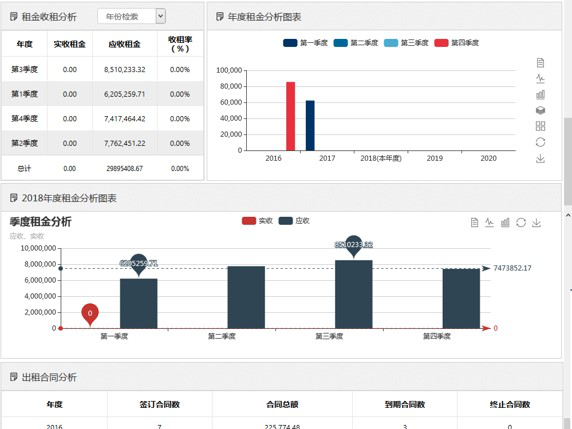 包括:資產(chǎn)產(chǎn)權(quán)使用分析、年度/季度/月度資產(chǎn)岀租分析、合同預(yù)期收益統(tǒng)計(jì)分析、租金實(shí)際收繳分析、合同到期預(yù)警分析、租金預(yù)期繳款分析等。
