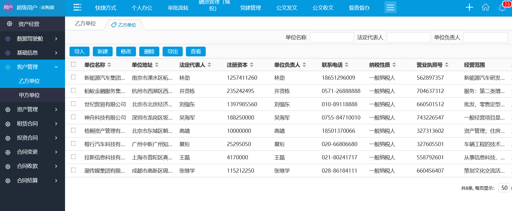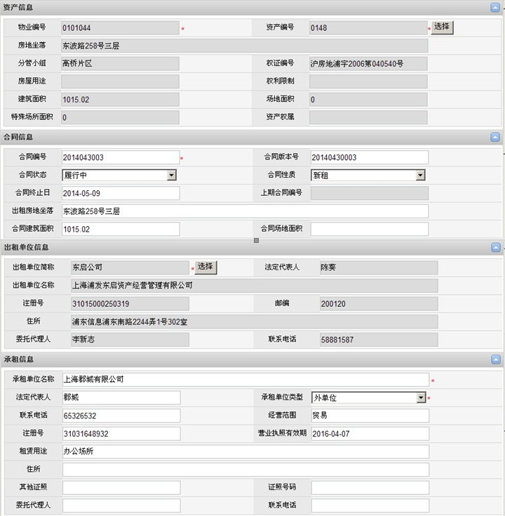 通過系統(tǒng)對各類運(yùn)營性資產(chǎn)的租賃合同進(jìn)行電子化流程簽審,包括土地租賃、廠房租賃、房屋租賃、輕資產(chǎn)租賃、設(shè)備租賃等,自動生成租賃合同信息臺賬庫,主要管理資產(chǎn)的租賃合同文件、合同基礎(chǔ)信息、資產(chǎn)使用狀態(tài)、承租模式(委托、 協(xié)議、招租等)、租金費(fèi)用、租期、支付方式、預(yù)期收益、租戶等信息進(jìn)行統(tǒng)一管理