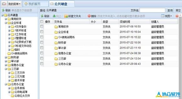 鶴峰縣中心醫(yī)院 二、信息化需求 鶴峰縣中心醫(yī)院已建立計算機信息管理系統(tǒng),包含HIS系統(tǒng)、電子病歷系統(tǒng)、電子醫(yī)囑系統(tǒng)、門診醫(yī)生工作站、檢驗管理系統(tǒng)(LIS)、醫(yī)學影像系統(tǒng)、城鎮(zhèn)醫(yī)保和新農合結算系統(tǒng),簡化了就診流程,為就診患者提供了“病人不動、信息流動”的一站式服務。同時建立了遠程會診系統(tǒng),可對各類危重病人、疑難病人與武漢協(xié)和醫(yī)院的專家進行面對面的會診。 現(xiàn)借助協(xié)眾協(xié)同辦公自動化系統(tǒng),加強醫(yī)院事務管理,提高醫(yī)院服務水平,擔當起為全縣人民健康保駕護航的重任。 三、協(xié)眾OA功能與實際應用舉例 網絡硬盤 我們借助OA模塊中"網絡硬盤"-"公共硬盤"功能為公醫(yī)院建立了相應的文件夾,可安排相關報表制作人把報表、醫(yī)院材料、病例分析存放在相應的文件夾中,供醫(yī)務人員及時獲取、分析信息。 網絡硬盤