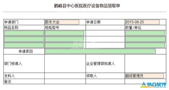 工作流 "新工作流"模塊實為我院OA利用中的最大用途,涉及財務、人事、物資采購等部門的工作,為我院提供了快捷、高效、節(jié)能的辦公秩序,以往的文件丟失、工作積壓、遺忘現(xiàn)象不再出現(xiàn),使得公司的運作又上升了一個檔次,所以公司對OA的使用工作贊不絕口也是鑒于此原因。原先OA自帶的工作流程及表格基本上不適應我院實際需要,為此我們著重根據(jù)自己的醫(yī)院實際情況重新制定了部分表格和流程。 例如醫(yī)院物品領取單: 醫(yī)院物品領取單-辦公自動化系統(tǒng)